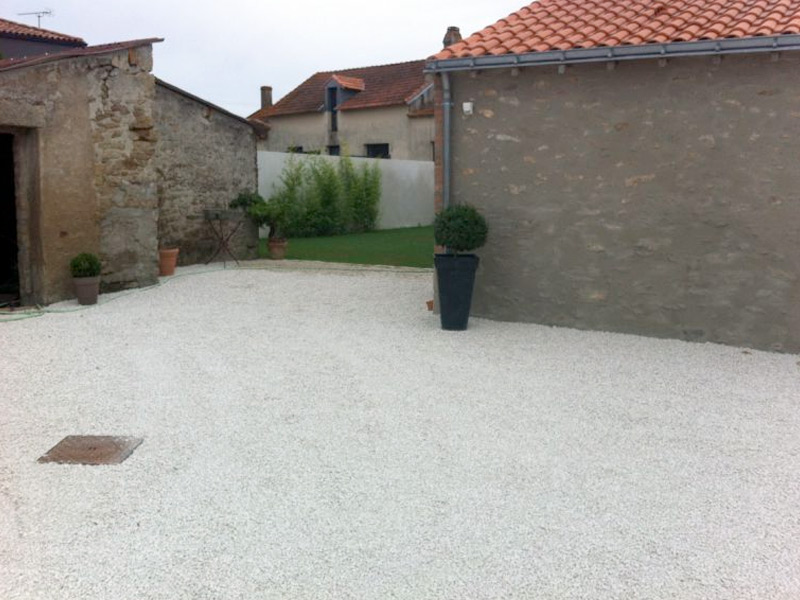 Un classique, le gravier calcaire compacté ou posé sur structure alvéolée.